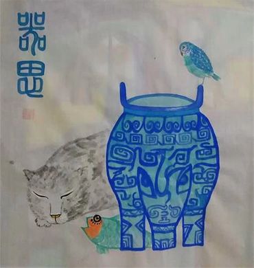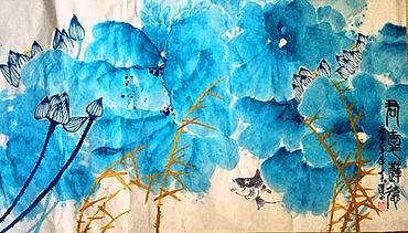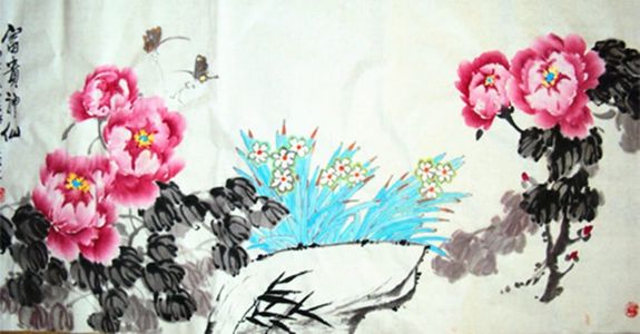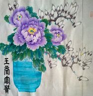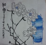 This painting is the most difficult line drawing technique in Chinese traditional painting to express the beauty of peony and blue vase. Flowers like white clouds, bottles like blue sky color.